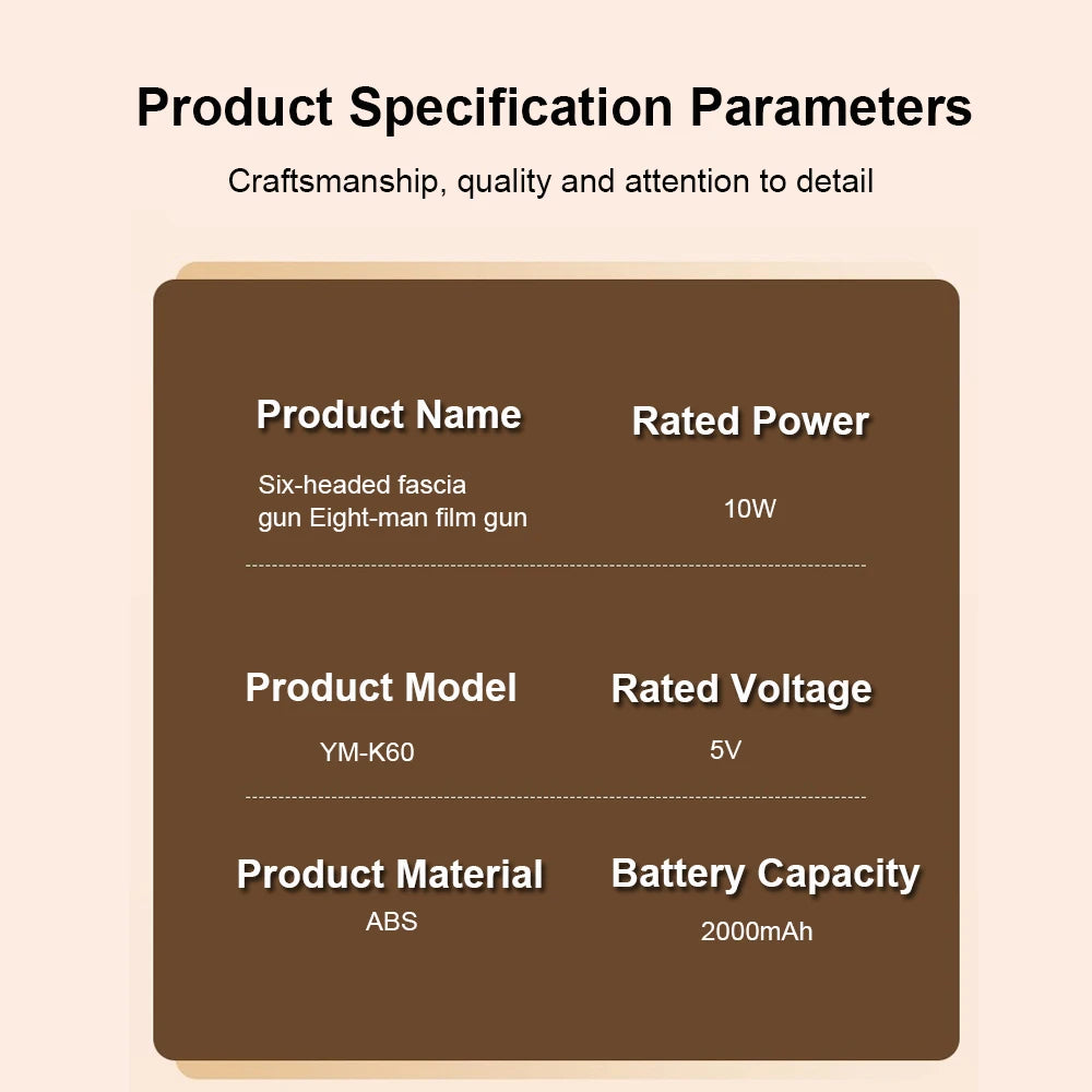 Integrated 6-Head Massage Gun: Six heads work synergistically to disperse the vibrations across a 300% larger coverage area than traditional one-head massage guns, especially suitable for targeting knots on larger muscle groups.